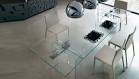 Tavolo allungabile con gambe in cristallo curvato trasparente. Tavolo Cattelan in cristallo allungabile con 4 sedie Bontempi. Tavolo allungabile rettangolare in cristallo ELAN DRIVE - Cattelan. Piano e prolunghe in cristallo trasparente o trasparente extrachiaro te.